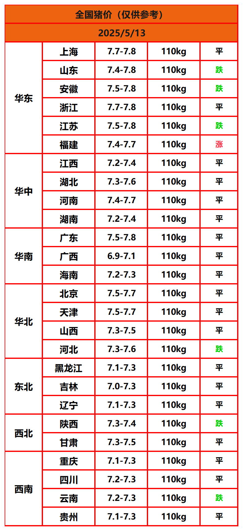 2025年5月13日猪价,今日全国猪价行情走势:1涨19平6跌。