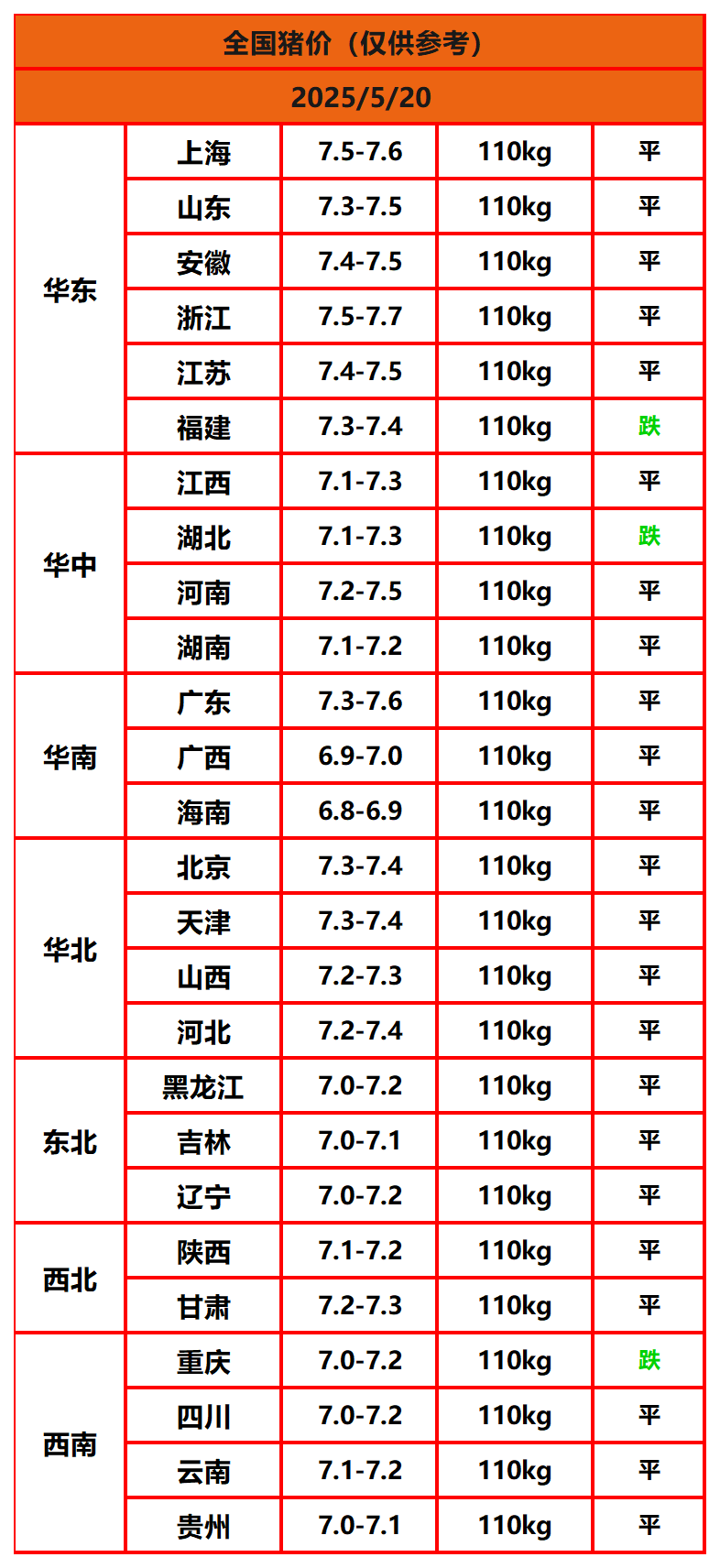 2025年5月20日猪价,今日全国猪价行情走势:0涨23平3跌。