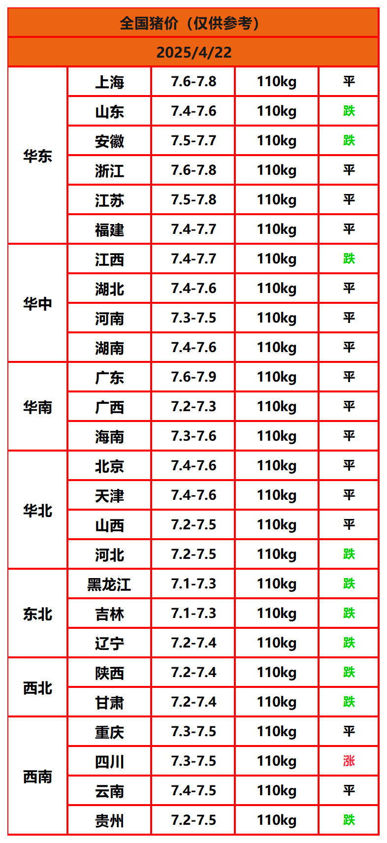 2025年4月22日猪价,今日全国猪价行情走势:1涨16平9跌。