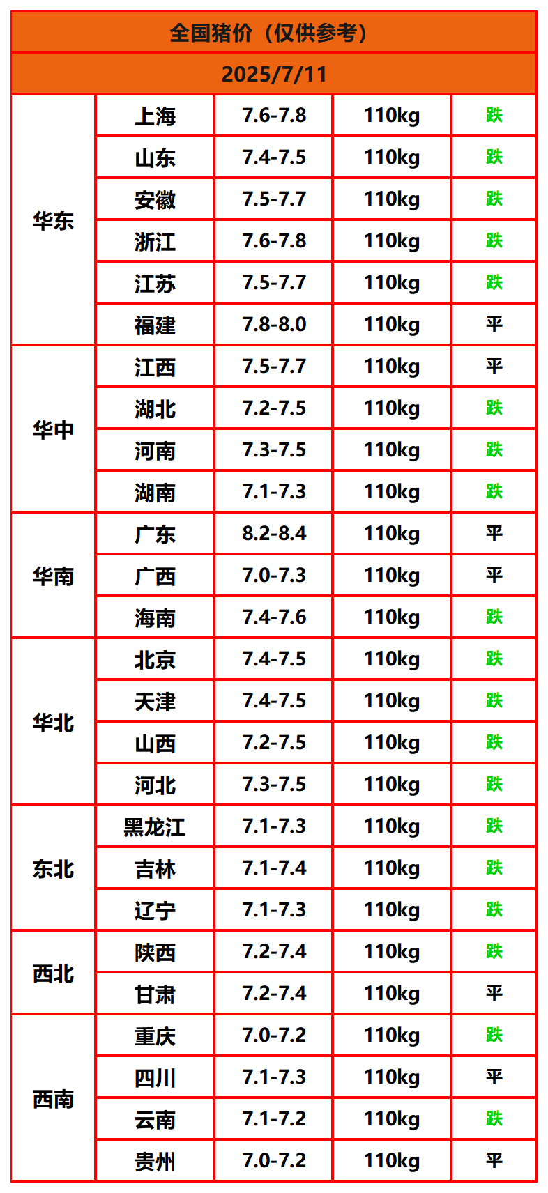 2025年7月11日猪价,今日全国猪价行情走势:0涨7平19跌。