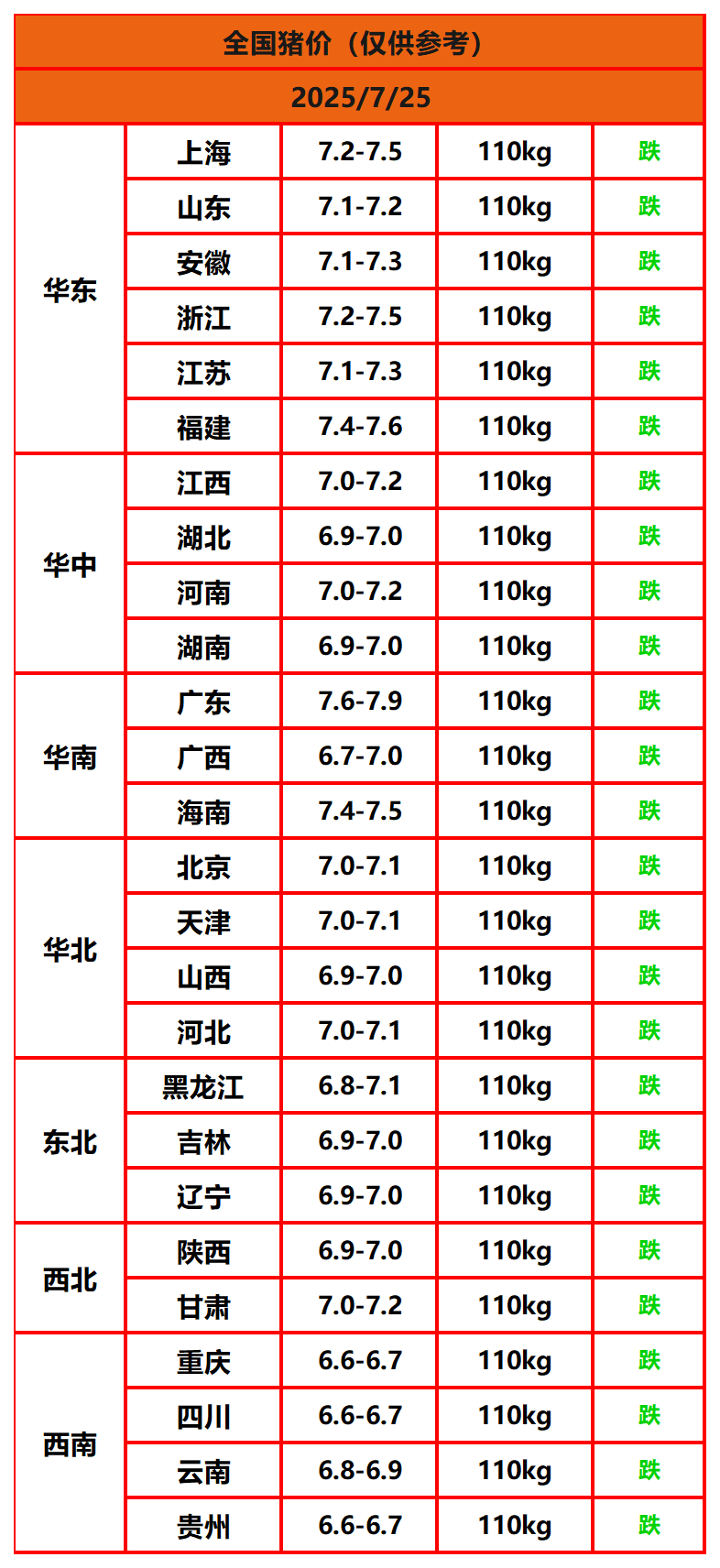 2025年7月25日猪价,今日全国猪价行情走势:0涨0平26跌。