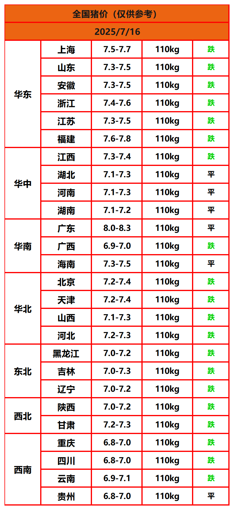 2025年7月16日猪价,今日全国猪价行情走势:0涨6平20跌。